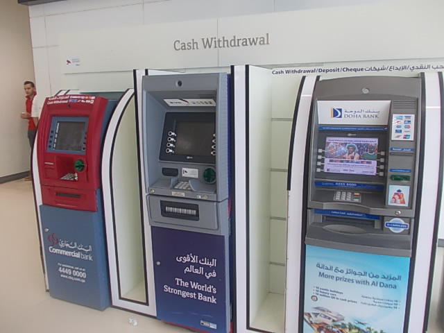 私はカタールに8時間程入国しましたので、取りあえずカタールリヤルが必要なため、その前の訪問先であるUAEで残ったディルハムを70Dh両替しました。これが68QRとなり、結局国内では15QRしか使わなかったので、米ドルに再両替しようと、計算上14ドルを戻してもらうために残ったカタールリヤルのうち、52QRを渡したのですが、米ドルというメジャーな通貨でさえ、1ドル札や5ドル札の用意はなく、10ドルからしかないといわれて、結局10ドルしか再両替できませんでした。尚、この少額でも再両替してくれたトラベレックスはまだましで(コミッションが2QR取られましたが)、ドーハ銀行の窓口では、50ドルからしか再両替不可と断られてしまいました。ATMのキャッシングは100QRからとなりますので、私のように滞在時間が短い方は少額での両替となるかと思いますが、出来るだけ無駄にならないよう、再両替の必要がないぎりぎりの金額での両替をお勧め致します。