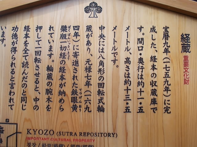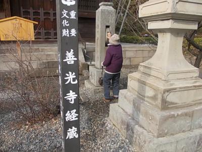 一際賑わう善光寺境内にあって、本堂から程近い距離に立地しているにも拘わらず、意外とひっそりとしていたのがこちらの経蔵です。その名の通り、教本の蔵として建てられた建築ですが、中央には回転式の輪蔵があって、これを回すと経本を一読したのと同じ功徳が積めるとされています。但し、通常は建築内の輪蔵は非公開ですので、建物の手前にある後生車のような石造りの輪を回すことで、代用している雰囲気でした。