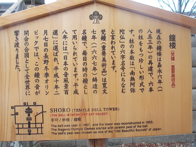 見所満載の善光寺ですので、意外と見落としがちなのですが、このお寺の本堂のすぐ脇にこちらの鐘楼があり、梵鐘に関しては、1667年に鋳造された名鐘として、重要美術品となっています。因みに1998年の長野冬季五輪の際には、この鐘の音が大会開始の合図となったということです。