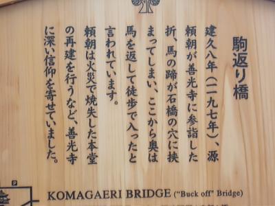 この橋は、鎌倉幕府を開いたことで有名な源頼朝が、善光寺参詣の際に馬の蹄がこの石橋に挟まってしまって、ここから先は歩いて参詣した、とされる、歴史的な逸話で有名ですが、現在ここを訪れても、橋として認知するのは極めて難しく、実際、殆どの方は素通りしているスポットです。この橋のどこに馬の蹄が挟まったのか、現在の雰囲気からはちょっと想像できないところが、逆に味わい深かったです。