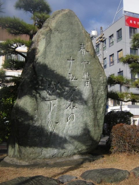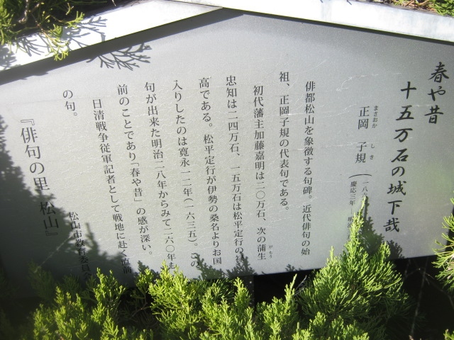 松山が誇る有名人、といえば、何といっても正岡子規ですが、JR松山駅前には彼の詠んだ句の一つ、”春や昔 十五万石の 城下哉”の句碑があります。