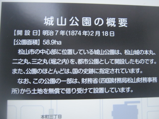 中でもこのエリアは、後者に該当する松山城の”麓”の部分で、広大な広場が拡がっていて、地元の方々が散歩やジョギングを楽しんでおられる姿を沢山見かけました。本丸エリアまで上がる時間や体力・経済力(?)がない方も、この麓の城山公園エリアを散策するだけでも、松山城らしい石垣の風情などを堪能することが出来ますので、是非足を運んでみて下さい。- 旅行時期
