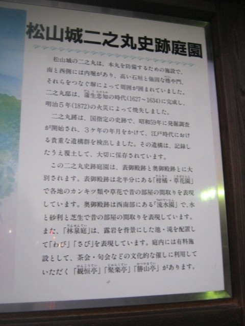 松山城の二之丸エリアに広がる、広大な史跡庭園です。松山城は本丸エリアも広いですが、ここや三之丸エリアとしての城之内地区もかなり広いので、全部を一度に見るのは大変だと思います。