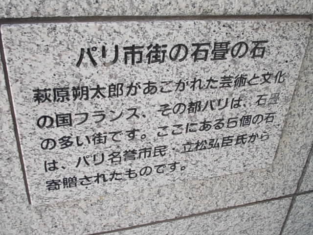 前橋が生んだ文豪、萩原朔太郎の展示をメインとした文学館で、ファンの方には必訪の場所だと思いますが、正直、文学に興味がない方には楽しめない施設かもしれません。でも、そんな方でも是非見て欲しいのが、入口のすぐ脇にある”5個のパリの石畳の石”です。なんでそんなものが文学館の入口に?と突っ込みたくなったのですが、これはパリに憧れた朔太郎の記念館的な本施設に、パリの名誉市民である立松弘臣氏が寄贈したとのいわれが、埋め込まれた石畳の石の上部壁面に刻まれていました。