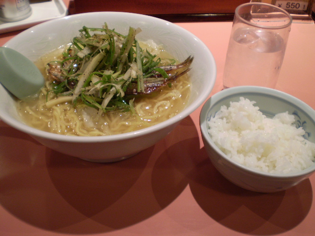 新千歳空港内で、適当に入って食べたお店でしたが、苫小牧ラーメン、という触れ込みで、近くの鵡川の特産であるシシャモを使用したラーメンを出していたのでこれをオーダーしました。ライス付きで850円という価格でしたが、味としては、やはりシシャモはそのままの方が美味しいかな、という印象でした。話の種としては面白いかもしれません。
