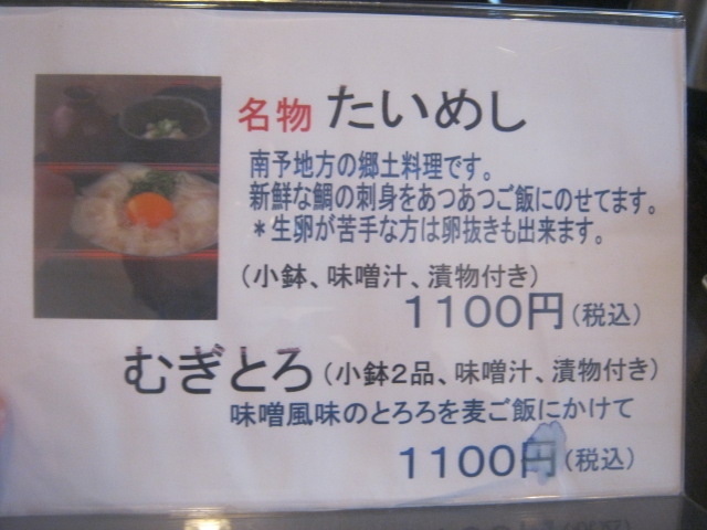 こちらのお店は、特に鯛めしが有名となっていて、観光客のほとんどはこれをオーダーされるそうですが、私は一食1100円という高価な昼食も身分不相応だと思ったので、じゃこ定食(660円)というのをオーダーしてみました。