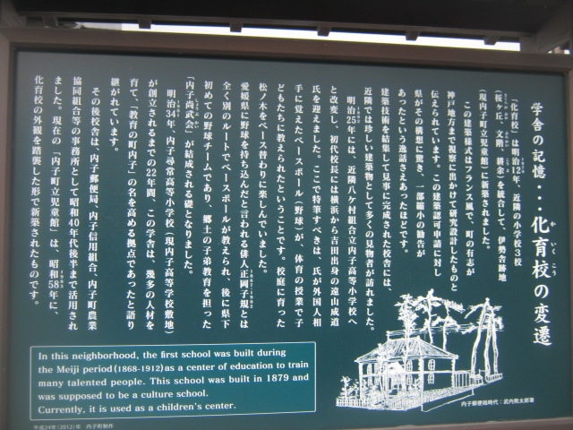詳細は解説板の画像をご覧頂きたく思いますが、私が特に興味を抱いたのは、この地で、野球殿堂入りも果たしている著名な正岡子規とは別ルートで、愛媛野球の先駆けとしての指導が行われていたという史実で、フランス風の美しい校舎の傍で、米国のスポーツが行われていたという二重の意味での国際的な環境下にあった当時を思うと、改めて内子は凄い町なんだなと感動しました。