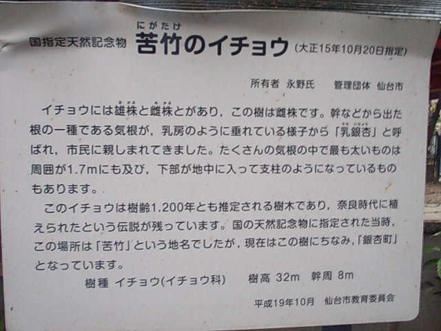 ここは地元では乳銀杏として知られていて、その名の通り気根と呼ばれる、乳房のように垂れ下がった構造がにょきにょきとあって、その独自な風情に圧倒されました。天然記念物にもなっていて、非常に見応えがありますので、是非足を運んでみて下さい。尚、名前からよく間違われますが、最寄り駅はJR仙石線上の苦竹駅ではなく、二つ仙台駅寄りの宮城野原駅となりますのでご注意下さい。