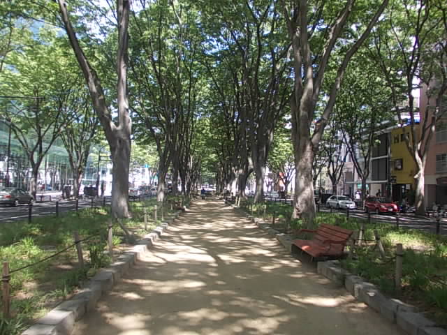 ここは冬の電飾イベントや夏のジャズフェスティバルなどで特に有名な場所ですが、平常時に関しては、道路の中央に続く欅並木の陰で涼みながら休憩するのにとてもよい場所です。ただ、道路の中央部を連続して歩くことが出来ず、交差点の度に信号を渡り直さなければならないので、通して歩くウォーキングの場所としてはやや不便な印象を受けました。