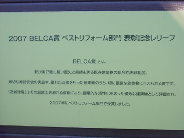 ここは現在、言わずと知れたプロ野球東北楽天イーグルスの本拠地として有名ですが、元々は県営のローカルな球場という風情でしたので、フランチャイズ移転後のこの球場の変化には驚きを隠せないというのが正直な印象です。現在正面入口にはベストリフォーム部門で受賞したことが誇らしげに掲げられていたりしますので、野球観戦以外の目的で外観を見て回る、というのも意外と面白いかと思います。