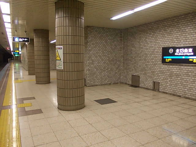 札幌の地下鉄東豊線は、観光客の方にとっては、どちらかと言えば札幌ドームの最寄り駅である福住方面に向かう路線という印象が強いかと思います。実際、さっぽろから南に向かう路線では、ドームでのイベント開催時に明らかに道外からいらしたという風な方を特によく見かけますが、北に向かう路線上は、完全に生活路線という風情で、さっぽろ駅の隣駅であるこの北13条東駅も、都心から近いとは思えない程ひっそりとしています。南北線の北12条駅や札幌駅からも徒歩圏内ですので、是非この駅も利用してみて下さい。特にドームに向かわれる際で混雑が予想される時などは、敢えてこの駅から先回りして座席を確保するというのも一案かと思います。