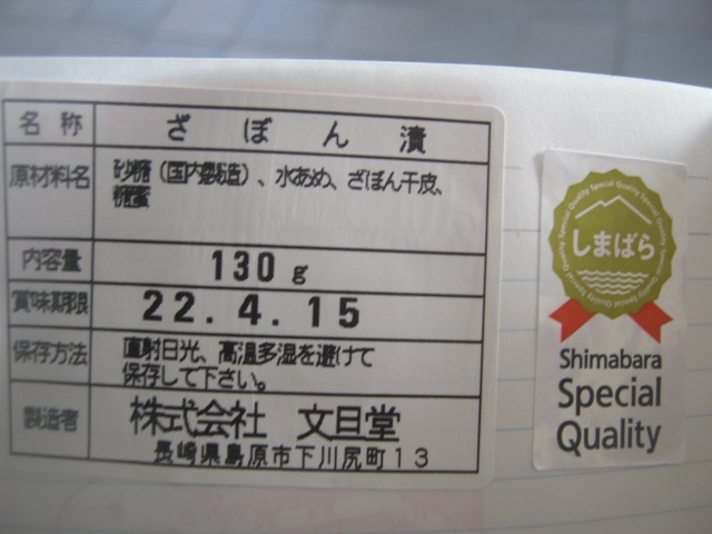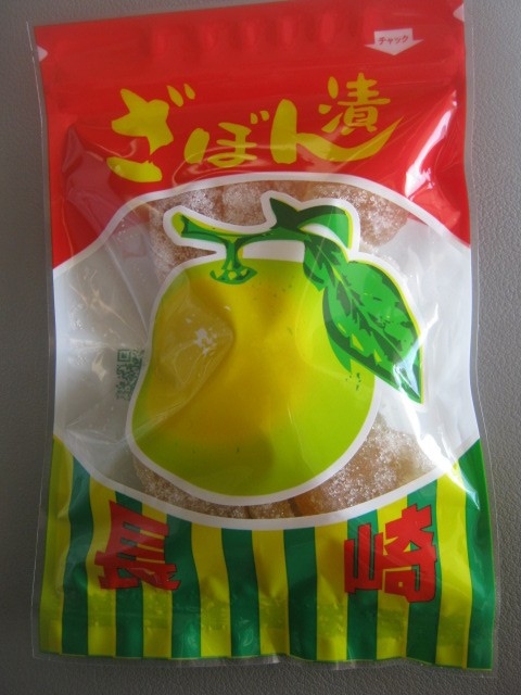 今回は島原土産として、こちらのざぼん漬を購入してみました。ダイナミックにカットされたざぼんの皮が砂糖漬けされているのですが、程良い苦みがアクセントとなっていて、絶品の美味しさでした。お店の方のお話では、直接食べるのも良いですが、ヨーグルトに入れて食べるのも美味しいそうなので、次回は是非、”ざぼんヨーグルト”を試してみたいなと思いました。因みにお値段は一袋440円でした。