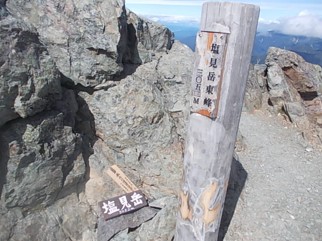 日本百名山に数えられる南アルプス中部の山として人気が高い塩見岳ですが、実はツインピークを成していて、三角点のある西峰(3047M)よりも、すぐ隣の東峰(3052M)の方が僅かに標高が高くなっています。三伏峠側からアクセスすると、最初に西峰が出迎えてくれて、三角点もありますので、特にガスっている際などには、東峰に登り忘れる方も多いようです。是非両方登って、塩見岳の”完全制覇”をお忘れなく…。