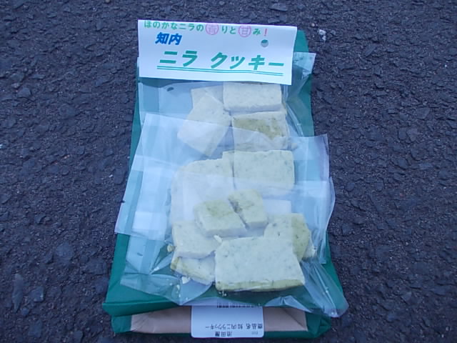 知内町はニラ栽培が有名な町ですが、ここにはニラクッキーなるスイーツが販売されています。ニラをクッキーにして大丈夫なのか、と、内心不安になりますが、食べてみると何とも癖になりそうな味わいで、確かにニラの匂いがします。好みが分かれるかと思いますので、お土産物としてはあまりお勧めできませんが、自分用に購入してみると良いかと思います。因みに一袋320円で3つの小袋に分けられていました。