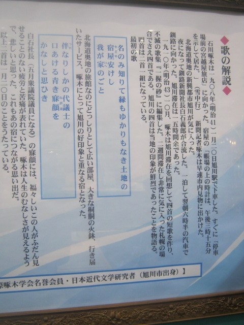 啄木は旭川訪問時に全部で4つの句を残していますが、それぞれの句には、旭川での冬の体験が見事に詠み込まれていて、その厳しい寒さには啄木も苦労したんだろうなと、特に同じような厳冬期に訪問してみると、身に沁みて感じることが出来ます。