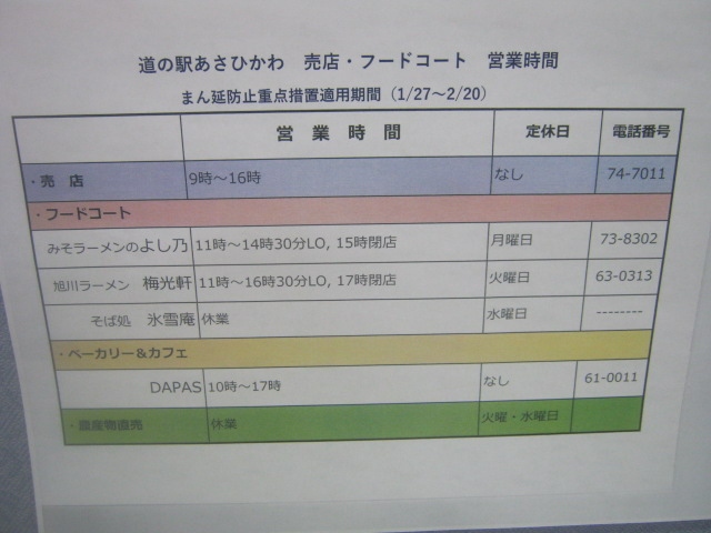 旭川市街地の神楽地区にあり、すぐ向かいに大雪アリーナなどもあるJR旭川駅からもほど近い距離の道の駅ですが、ここは2021年以降、大展示場がコロナワクチンの旭川市民向け集団接種会場に運用されている関係で、接種のために車でやって来る市民達で不自然に混雑することが多くなりました。特に、駐車場は異常な混雑を見せていますので、観光目的のお車族の方は他の道の駅を目指された方が良いかと思います。