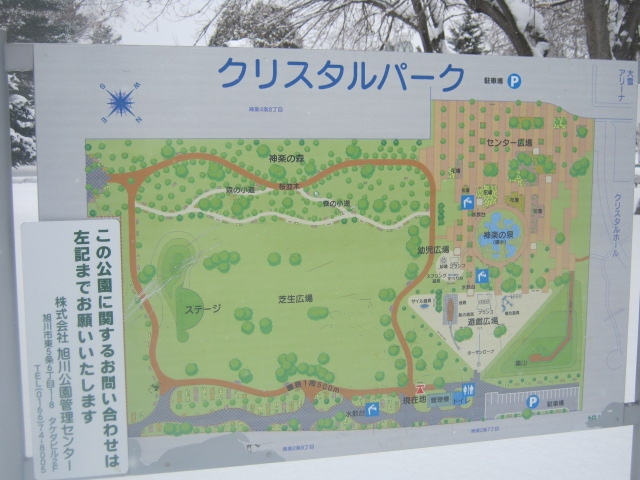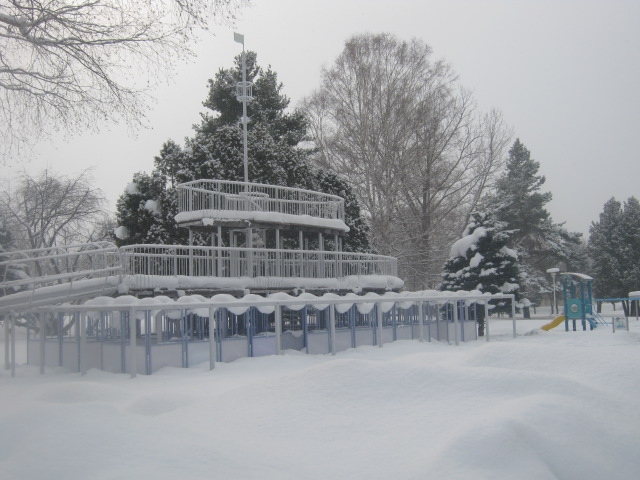 今回はJR旭川駅から大雪アリーナに至る途中に、こちらの公園に立ち寄りました。流石に二月という時期は園内のほとんどの場所は除雪もされておらず、遊具が並ぶエリアも完全に冬籠り状態でしたが、地元の子供がたまに遊びに立ち寄っている感じで、微妙な踏み跡が見られて、一部の遊具までは雪に足を取られることなくアクセスすることが出来ました。