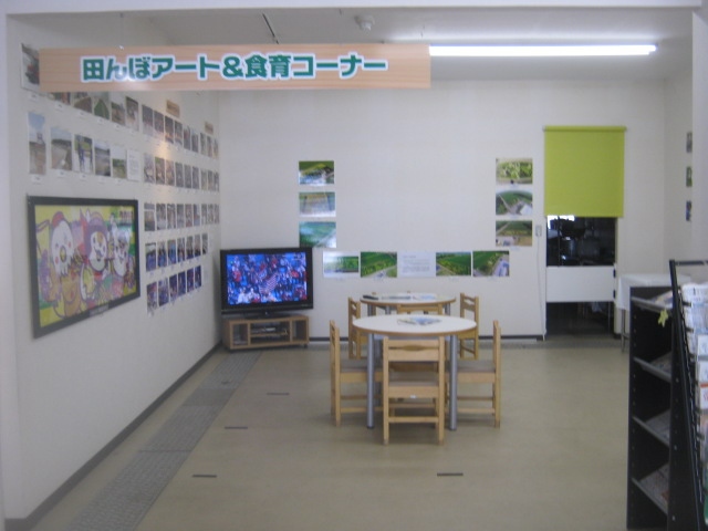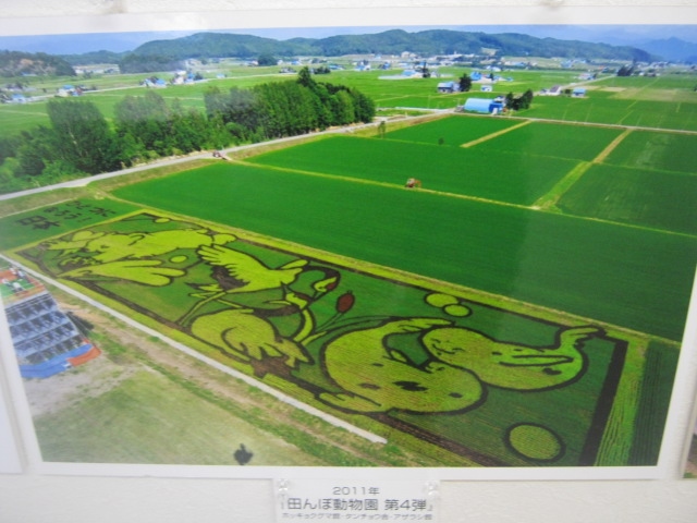 ただ、そんな”オフシーズン”こそ注目したいのが、ここの端にある”田んぼアート&食育コーナー”と呼ばれる、壁面に写真展示が並んだ休憩ブースで、今回の私はたまたま北京五輪のフィギュアスケート開催時間帯だったので、ここにあるテレビ目的(不純でごめんなさい)で立ち寄りましたが、JAたいせつでは2006年から始めている、歴代の田んぼアートの写真が並んでいて、これが非常に見応えがあります。