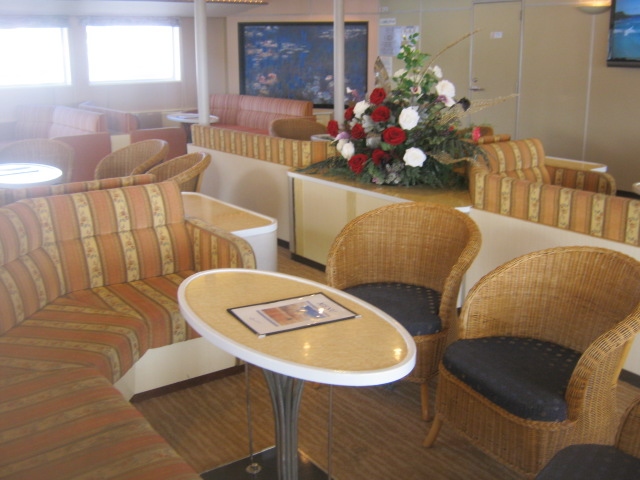 下の階の他のエリアには通常の座席が並びますが、上の階のラウンジのようなところの方が広々としていて居心地も良いので、私の乗船時は空いていたこともあり、殆どの乗客の方が上の階でゴージャスな雰囲気の中過ごされていました。