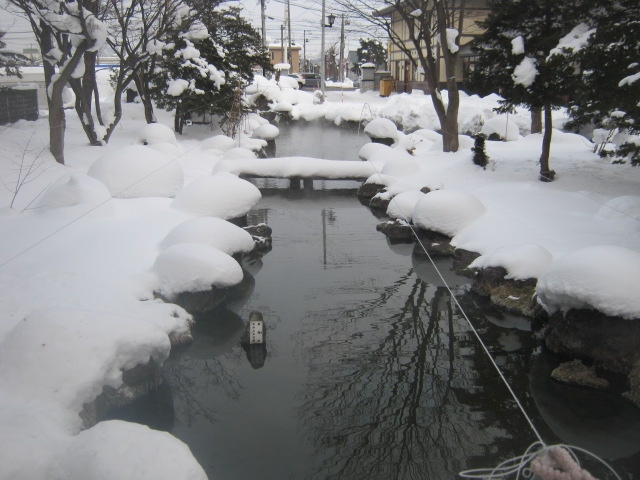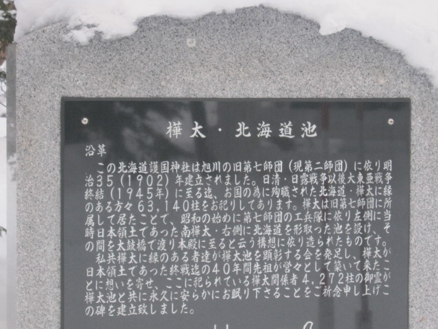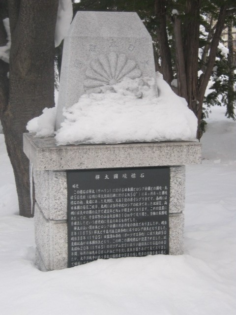 以前もご紹介させて頂きましたが、ここの境内には樺太と北海道を模した形の池があり、普段の冬だとその形が完全に判らなくなってしまう程なのですが、この年は特に樺太側に関しては、縦長の形状が雪に埋もれずによくわかる状態でしたし、完全に埋もれてしまう筈の日露国境標石レプリカも、この年はまだちゃんとその姿を拝むことが出来ました。- 旅行時期
