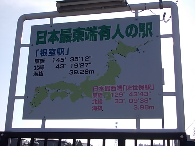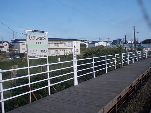北方領土問題が存在するこのエリアでは、日本最東端、という言葉を使用する際に少し神経質にならざるを得ませんが、北方領土内に鉄道が走っていない、という前提の上で、現段階において日本最東端の駅といえるのがこの東根室駅です。ホーム上には緯度経度が記された日本最東端の駅のプレートが設置されていますが、実は駅を降りた下側には、もっと立派な木製の最東端の駅の碑が設置されていますので、車などで訪問された方は、こちらの前で記念撮影するのも良いかと思います。根室駅からも歩いて行ける距離(徒歩片道30分程度)ですが、住宅地の中にあってちょっと判り辛いかと思いますので、地元の方に道を尋ねながら探してみて下さい。