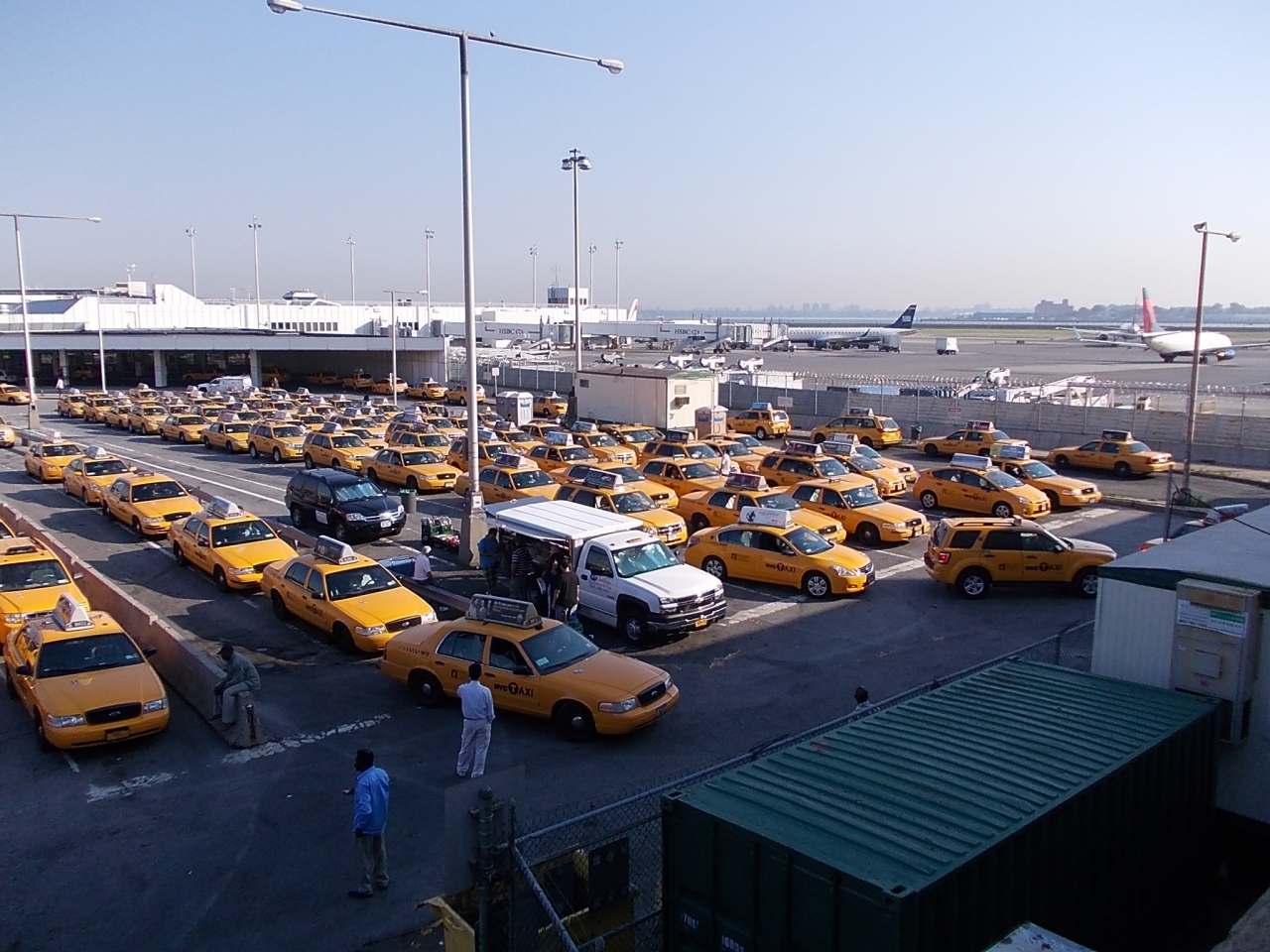 本来このカテゴリーは、タクシーの利用に関する体験談などをクチコミされるのだと思いますが、ここは敢えてイエローキャブが沢山見られる場所、しかも航空機と一緒に撮影できるスポットについてです。場所はNYのラガーディア空港、ターミナルが幾つかありますが、デルタのターミナルとUSエアウェイズのターミナルの間で、この光景が見られます。特にデルタターミナルの出発ロビーをメインターミナル側に進む感じで見ると、なかなか迫力がありますので、マニアな方は、是非見に行ってみて下さい。
