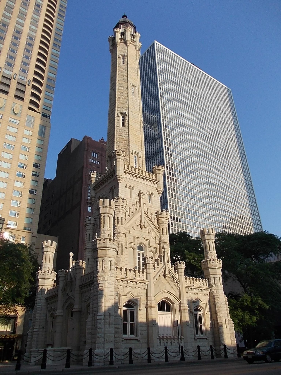 シカゴは大火事で壊滅的な被害を受けた悲しい歴史を持つ町ですが、その時に焼け残った貴重な建築がこのウォータータワーです。近代的なビル群の中に突如としてレトロな建物が現れるのでびっくりしましたが、やはり貴重な文化財は見逃せませんね。この建築の移転を巡って猛反対があって、マグニフィセントマイル(ミシガンアベニュー北部)は、このタワーを境にちょっと曲がっています。交通の利便性よりも歴史の重みを優先したシカゴ市民の思いには頭が下がります。