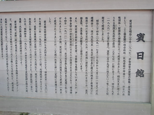 景勝地として有名な二見浦では、つい海の方に目が行ってしまいますが、散策道を辿ると立派な近代建築が見えてきます。ここ賓日館は、元々は明治天皇のお母様が保養で滞在される際に、急遽建造された由緒ある場所で、その後も歴代の皇族の方々や、各界の要人が多数滞在されているそうです。残念ながら、一般の観光客は宿泊することは出来ませんが、伊勢市の資料館として見学することが出来ますので、夫婦岩やカエル神社とはまた違った美しさを楽しむために、是非足を運んでみて下さい。