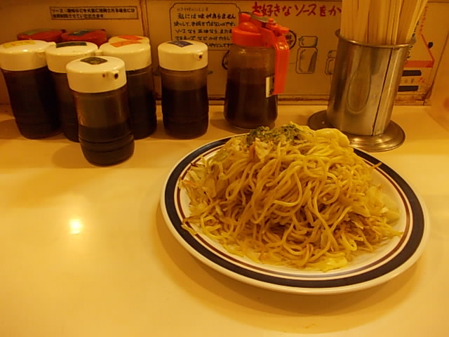 観光で札幌を訪れた方は、まず札幌で焼きそばを食べよう、という気にはならないかと思いますが、札幌暮らしで貧乏な時によくお世話になっていたのがこのお店です。まずサイズが色々とありますので、腹の空き具合によって選べるのが良いですが、この焼きそばには味が付いておらず、カウンターに備え付けられている色々なソースを各自で注いで味付けするというシステムなので、一皿で色々な味を楽しめるのが良いです。