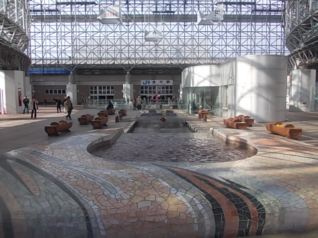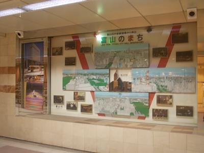2012年1月現在、富山駅周辺は、北陸新幹線工事の関係で、かなり流動的な状態でしたので、ここでは敢えて、暫くは変更しないと思われるスポットについて…。富山駅は正面口である南口と、近くに岩瀬浜方面へのライトレール発着駅がある北口とに分かれていますが、両者はかなり離れていて、改札を通らない場合は、地下通路経由で逆側に向かうことになりますが、この地下通路の途中には、色々な富山の物産広告や富山の観光名所をデザインしたミニ絵画など、ざっと富山を観光した気分になれるのでお勧めです。但し、途中からは全く何もない無味乾燥な通路が続きます。こちらも何か通行する人を楽しませる趣向を今後期待したいです。