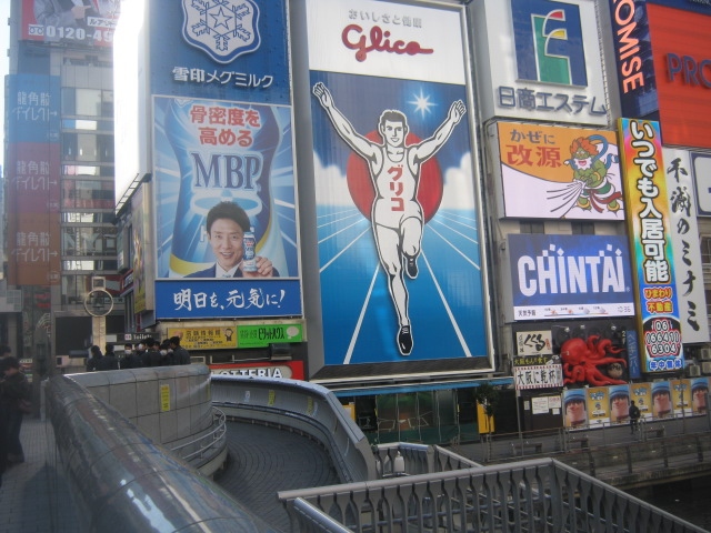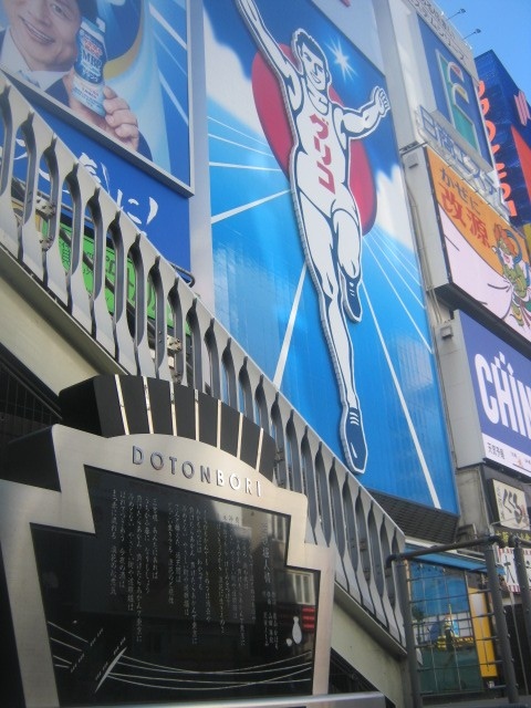 大阪と言えば、これを連想される方も多いでしょう。まさに、ランドマーク的な存在なのですが、観光客の方々の多くの動向を見ていると、戎橋の上からの景観を楽しんでいる方が殆どです。ただ、実は道頓堀川の河畔は歩けるようになっていて、この直下から眺めるグリコの迫力もまた良いんです。丁度すぐ傍に、道頓堀人情の歌碑があり、ボタンを押すと曲が流れるようになっていますので、普通の観光客で賑わう、戎橋からの”上グリコ”の人々を傍観しながら、しみじみと”下グリコ”を味わうのが昭和人向けだと思います。
