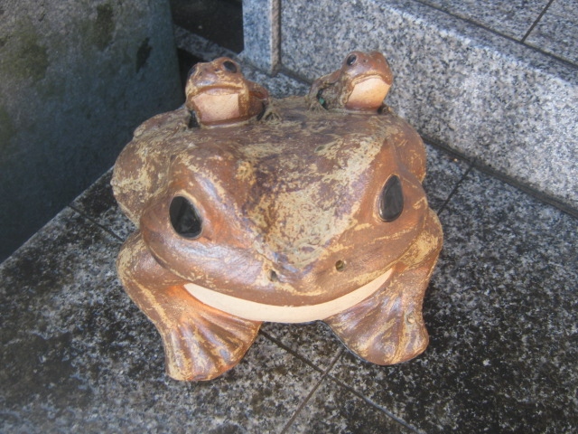 高津宮のすぐ東側にあるお寺で、付近は閑静な住宅街という風情なので、案外ひっそりとした感じで佇んでいました。本堂向かって左手に何やら茶色いのが見えるなと近づいてみたら、二匹の子ガエルを背中に配した信楽ガエルさんでした。カエルマニアの方にお勧めしたいお寺です。