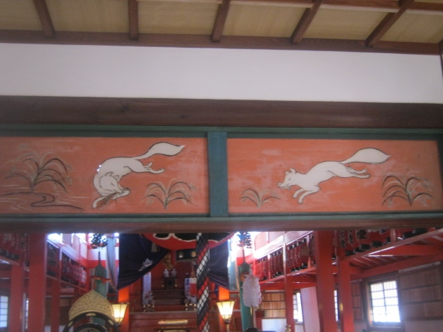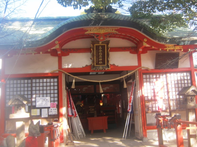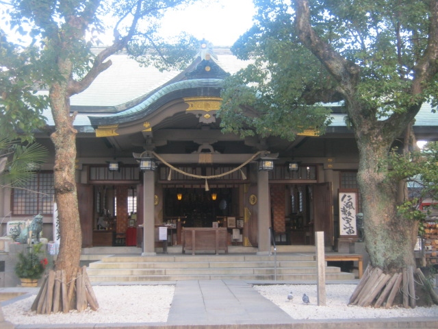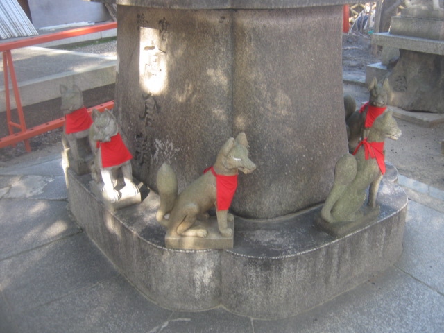 高津宮の本殿向かってすぐ右側にある稲荷神社です。お稲荷さんなので当然ですが、狛犬ではなく狐が祀られていますが、この稲荷神社は、他の稲荷神社と比較しても、狐さんの色合いが強くて、狐好きの方には特におすすめできると思います。