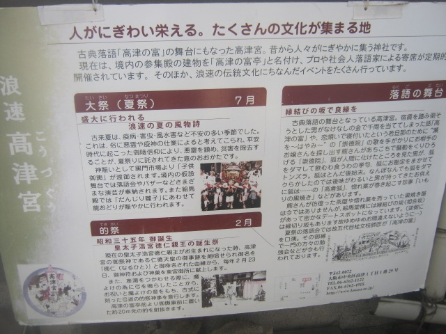 現在の高津宮(高津神社)は立派な本宮(本殿)を有しており、一帯では随一の規模を誇る神社となっておりますが、実は元々は、この小さな祠が原点だったそうで、本宮の裏手でひっそりと建つ、本宮に委縮しているかのようなこじんまりとした現在の姿は、ちょっと侘び寂びも感じてしまいます。