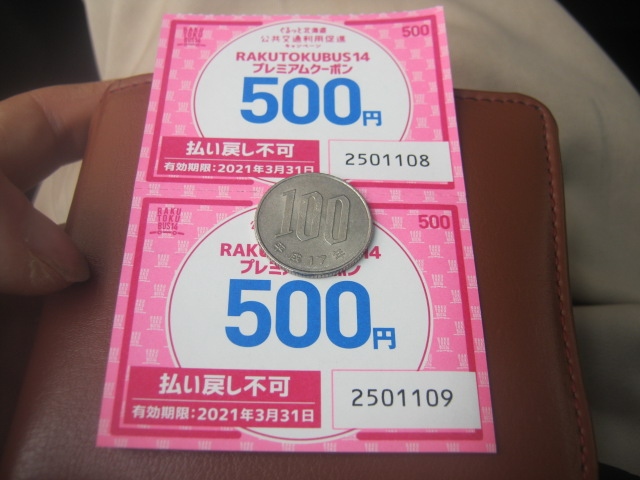 今回はコロナ禍対策の一環として販売されていたプレミアムクーポンを利用して乗車しましたが、通常運賃は1100円(一部1000円になる区間もあります)なので、500円券2枚と100円玉一つで乗車しました。クーポンは三割引きでの販売なので、実質的には700+100=800円で乗車出来た計算になります。