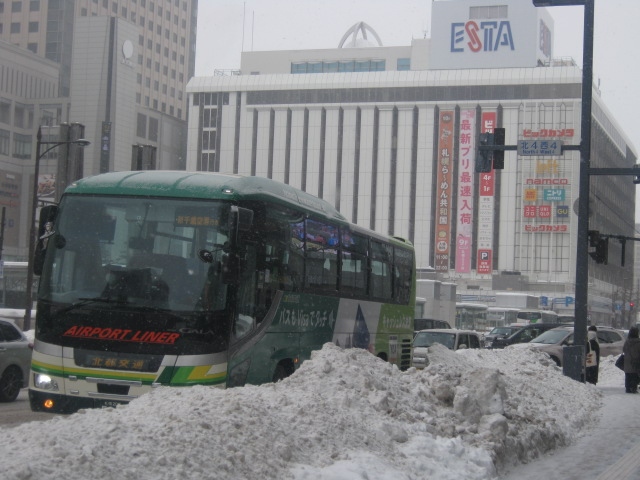 札幌=新千歳空港間は幾つかの路線の高速バスが運行されていますが、この系統が正直一番混雑する上に、冬場は国道36号線が渋滞することも多くて、利用を覚悟される方は、基本的に所要二時間は見ておいた方が良いです。(夏道だと70分程度が通常。)この日も結局1時間50分位かかりました。