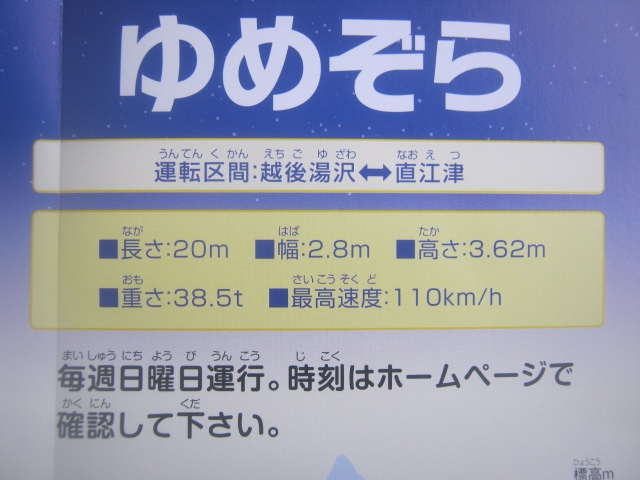 現在の北越急行において、一番観光的側面から有名になっているのが、こちらの「ゆめぞら」車両です。2021年12月現在で、HK100-8とHK100-9の二両がゆめぞら車両として運用されていますが、運行は通常日曜日のみなので、くれぐれもご注意ください。