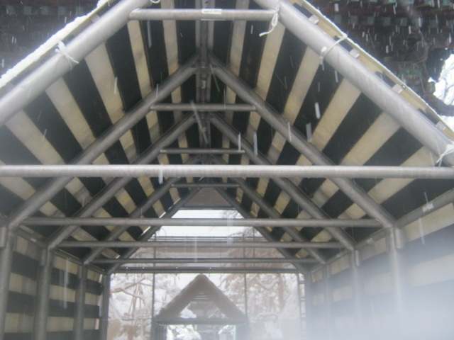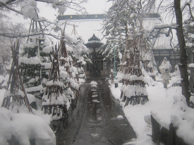 で、本堂前に到着すると、まず山門が凄く頑丈な冬囲いで覆われている感じで、やはり相当な積雪量になるんだろうな、とその姿に圧倒されました。冬ならではの光景を眺めるのも良いものですね。- 旅行時期