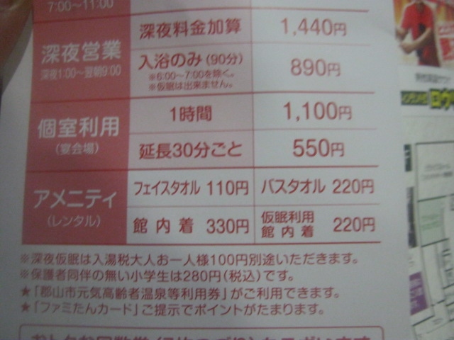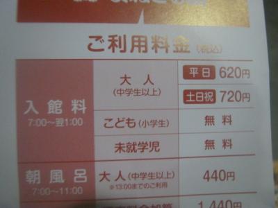 通常の入浴料金は620円(日祝日は100円増し)ですが、夜1時以降に滞在の場合は深夜料金が1440円加算となります。深夜利用の場合でも、上着類やタオルなどは別料金になりますのでご注意ください。あと、入湯税が100円徴収されます。