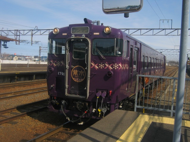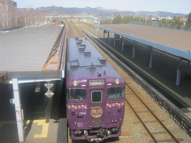 そんな悲壮感漂う根室本線に、今回は全く”根室臭”の感じられない滝川~富良野間で乗車しました。この区間は基本的にキハ40で長年運行されていますが、今回は、何と特別塗装の「紫水」さんにこの区間で初乗車することが出来ました。