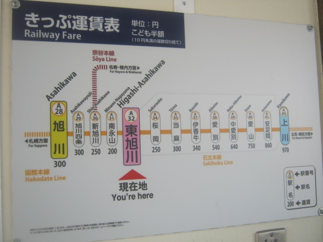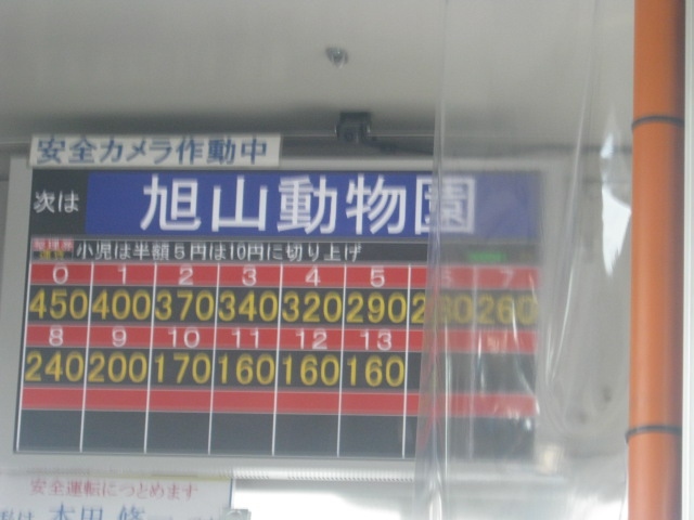 因みに、旭川=東旭川のJR運賃は300円ですので、トータルで470円となります。旭川駅前から動物園までバスで直行すると、運賃は450円となっていますので、通常ですと、乗り換えまでして、更に運賃が高くなってしまうこのルートを使うことはお勧めできませんが、JRフリー切符利用時はご一考されてみては如何でしょうか。往復で500円以上安くなる計算ですので、差額で動物園内のパン屋さんの名物のメロンパンでも頂けてしまいますよ~( ´∀` )。