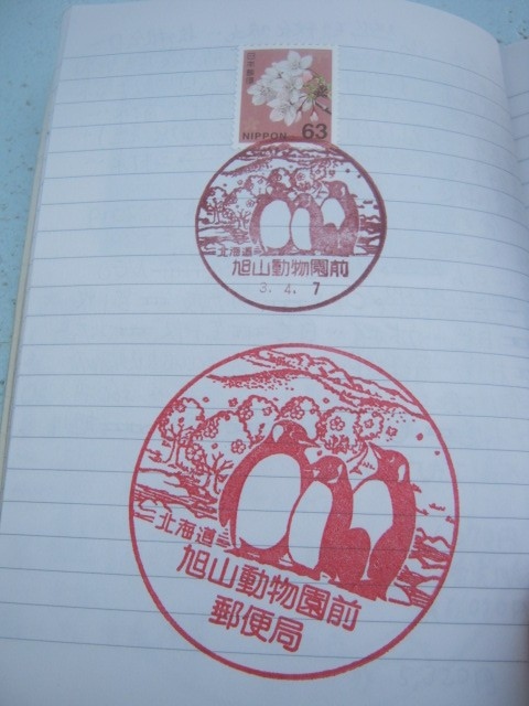 実は、旭山動物園には、園内に郵便局や出張所などはなくて、記念押印は出来ないのですが、正門から歩いて7~8分程度の距離の場所に、旭山動物園前郵便局というのがあって、ここには風景印は勿論、切手を貼らなくても押させてもらえる記念スタンプまで用意されています。