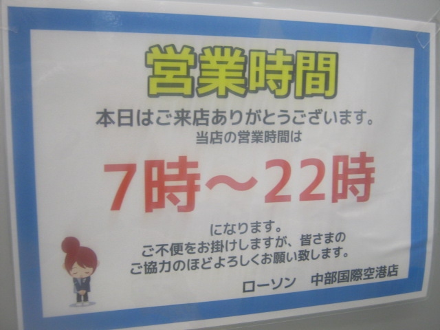 因みに、空港内のコンビニとしてはもう一つ、名鉄駅の向かいにファミリーマートがありますが、こちらも時短営業中だそうです。ただ、微妙にローソンよりは1時間ほど長い時短(23時まで)とのことでした。コロナの動向次第で状況は流動的ですので、深夜時間帯にご利用をお考えの方は、事前に最新情報を確認されておくことをお勧めいたします。- 旅行時期
