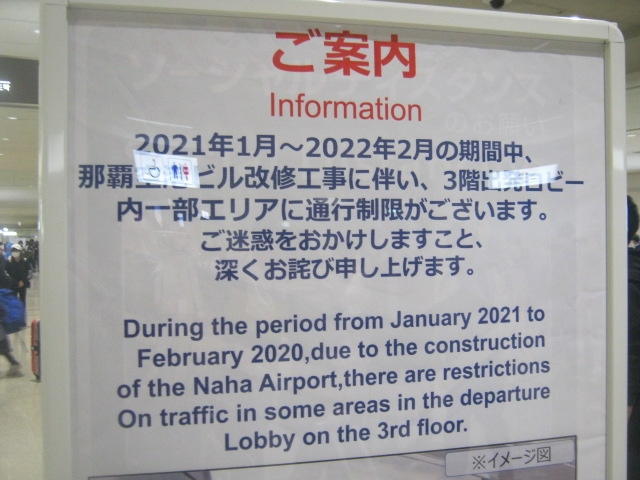 後でちょっと事情を伺ってみると、どうやら私が訪問時点(2021年3月26日)では、那覇空港の国内線エリアにて、特定天井改修工事(2024年末までを予定)と、フリーコンセントの設置工事(2022年3月末までを予定)の二つの工事が進行中だそうで、色々とごちゃごちゃした運用が予想されるとのことでした。