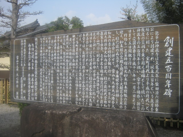 貴船神社との繋がりで立地している高台の上に建つお寺で、創建は1501年ということで、かなりの歴史があるお寺です。山門をくぐると、まず右手に2001年に建てられた創建500年の立派な記念碑も建っています。