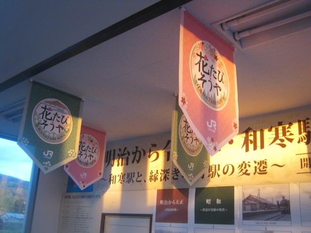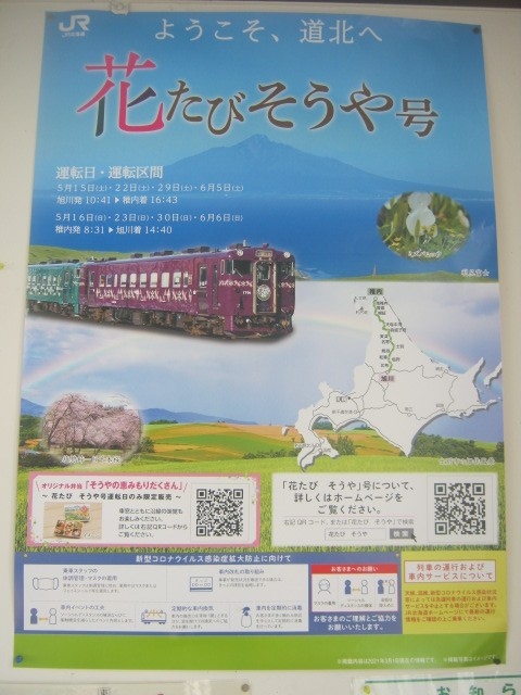 因みに私の地元の最寄り駅の和寒駅構内でも、花たびそうや号のヘッドマークをあしらった吊るしタイプの幟も多数設置されて、受け入れ態勢万全の様子も確認しておりましただけに、昨年はこの用意すらできない中での満を持して、という思いの中での運休の発表はかなりショックでした…。