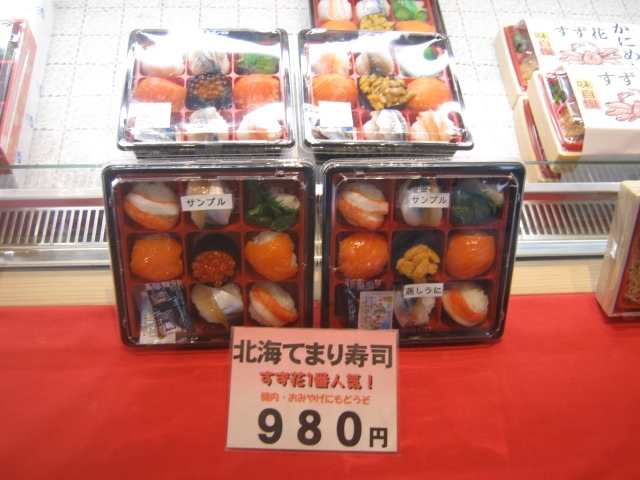 空弁だけでも結構色々なメニューがあって迷うのですが、正直、庶民以下の金銭感覚では、ちょっとお高い商品ばかりでした。店員さんにお勧めを伺ってみると、一番人気の北海てまり寿司(980円)というのを勧められたので、素直にそれを購入。因みに、このお弁当では、9マスの中に4種7つ(残り2マスにはわさび・醤油と、お漬物・生姜が入っています)が入っていますが、中央部に一番お高いメニューが一種入っていて、この一種をウニかイクラかで選ぶことが出来るようになっています。後の6マスには、サーモン・カニ・鯖が二つずつ入っていますが、ウニとイクラを両方食べたい、という方には、同じデザインで、両方入った特上寿司(1280円)という選択肢もあります。