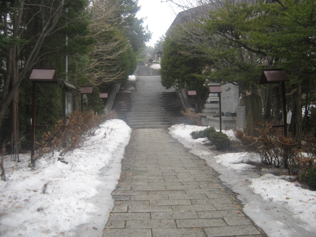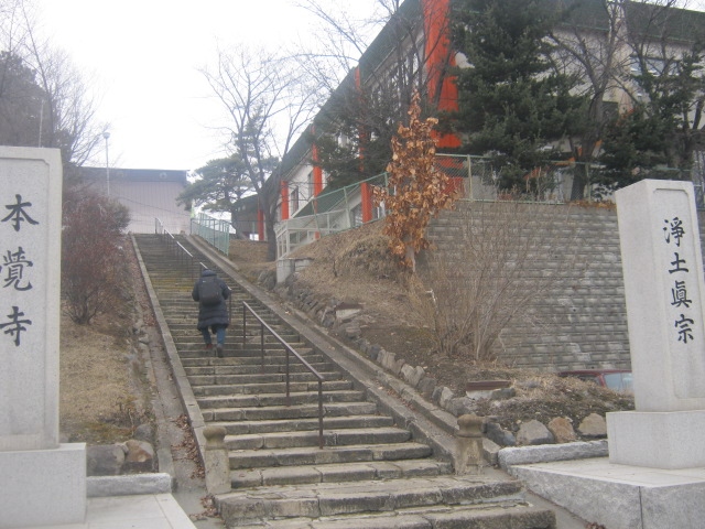 なので、本堂にアクセスする際は、北見神社側から続く道路を、坂を下らずに手前の裏手の門をくぐって行くと、石段を登らずに済みます。