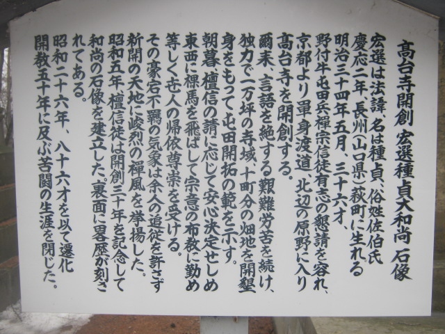 逆に本堂に関しては、割と近代的な風情の建物なので、観光という側面からは物足りなさを感じますが、山門の脇には、高台寺を開創した宏選種貞大和尚の立派な像が建っていたり、夭折した薄幸の女性や子供、水子の供養を目的に建立されたという微笑(みしょう)観世音様なども鎮座していらして、非常に見応えがあります。是非、ゆっくりと時間をかけて巡って頂きたい、これまでに私が北見で訪問したお寺の中では間違いなくナンバー1のお寺です。- 旅行時期