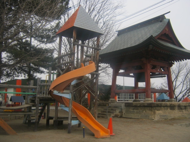 浄土真宗本願寺派に属するお寺で、立地的には北見神社のすぐ東隣なので、見つけやすいお寺かなと思います。幼稚園が付属しているお寺でもあって、私の訪問時も、近くの遊具で遊ぶ子供達の賑やかな歓声に包まれていました。鐘楼が遊具に囲まれている、という混とんとした風情もある意味味わいがありました。